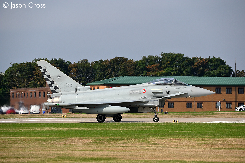Typhoon MM7345 of the Italian Air Force (Aeronautica Militare) after landing on runway 02 at RAF Waddington. Exercise Cobra Warrior. Date: 14 September 2022 Manipulation Notes: None