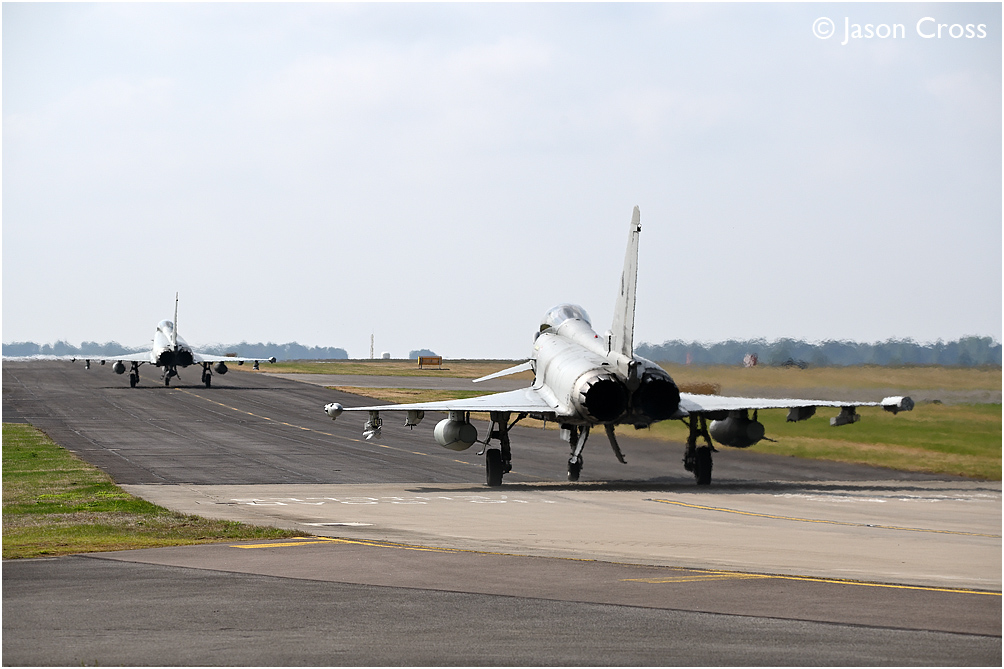 Typhoons MM7317 and MM7298 of the Italian Air Force (Aeronautica Militare) make their way along delta taxiway at RAF Waddington. Exercise Cobra Warrior. Date: 14 September 2022 Manipulation Notes: None