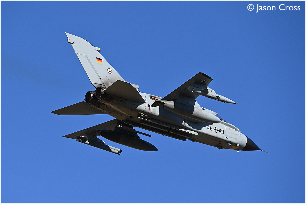 Panavia Tornado 46+23 of the German Air Force (Luftwaffe) taking off from runway 02 at RAF Waddington. Exercise Cobra Warrior. Date: 16 September 2022 Manipulation Notes: None