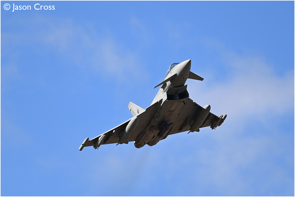 A Typhoon of the Italian Air Force (Aeronautica Militare) taking off from runway 02 at RAF Waddington. Exercise Cobra Warrior. Date: 14 September 2022 Manipulation Notes: None