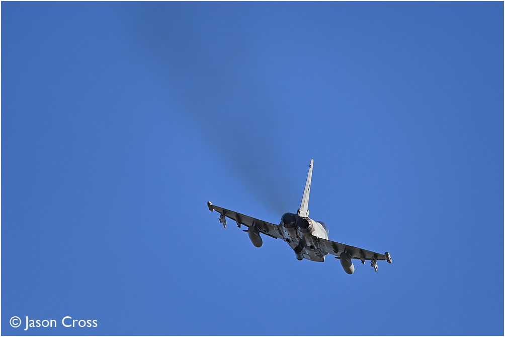 A Typhoon of the Italian Air Force (Aeronautica Militare) taking off from runway 02 at RAF Waddington. Exercise Cobra Warrior. Date: 14 September 2022 Manipulation Notes: None