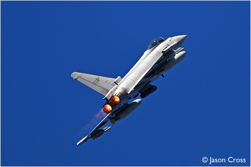 Typhoon MM7313 of the Italian Air Force (Aeronautica Militare) sticks it into after-burner and goes vertical upon take off from runway 02 at RAF Waddington. Exercise Cobra Warrior. Date: 14 September 2022 Manipulation Notes: None