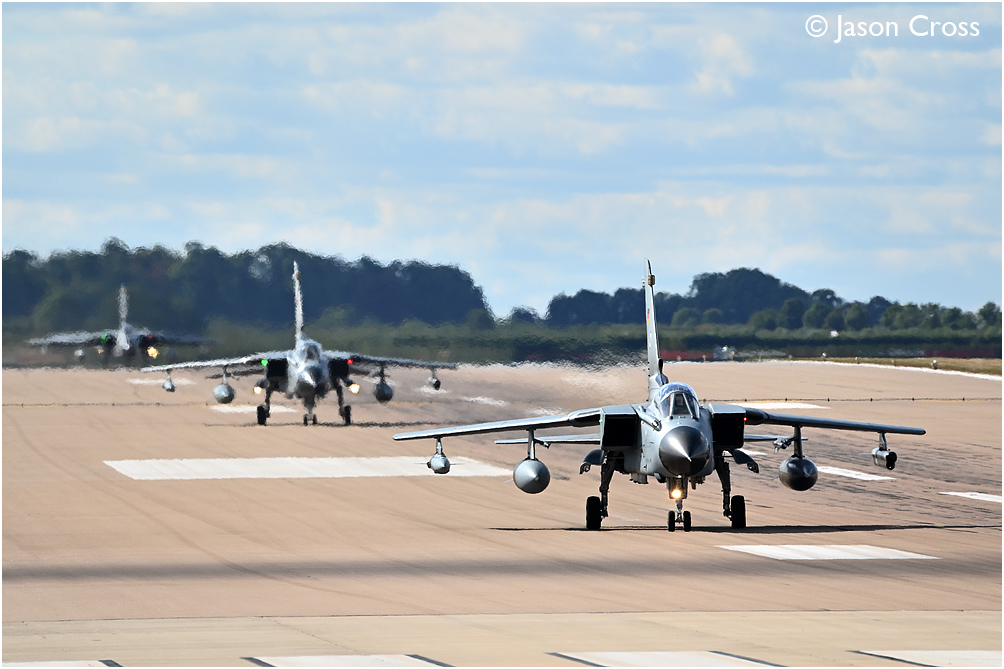 Panavia Tornados 46+23, 46+32 and 46+51 of the German Air Force (Luftwaffe) landing at RAF Waddington. Exercise Cobra Warrior. Date: 16 September 2022 Manipulation Notes: None