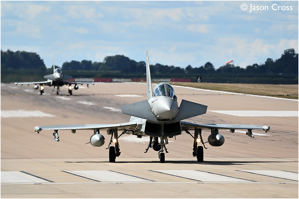 Typhoons MM7298 and MM7345 of the Italian Air Force (Aeronautica Militare) on the runway after landing at RAF Waddington. Exercise Cobra Warrior. Date: 16 September 2022 Manipulation Notes: None