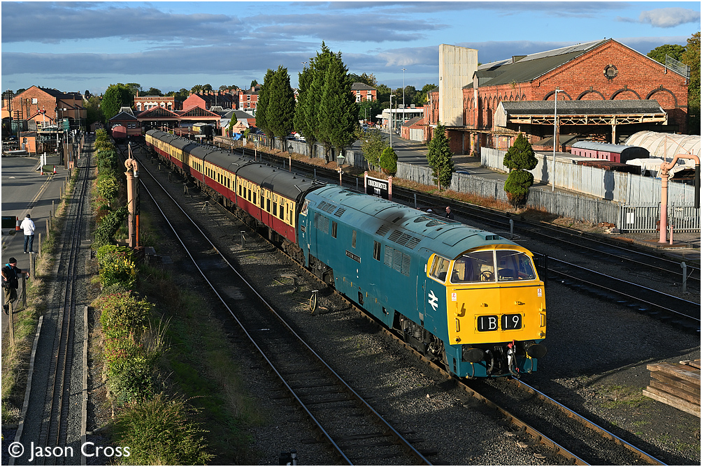 Western D1062 disguised as D1040 'Western Queen' waits to depart from Kidderminster with the 1745 to Bridgnorth. Severn Valley Railway diesel gala. Date: 2 October 2022 Manipulation Notes: None Camera mounted on a tall pole and remotely fired