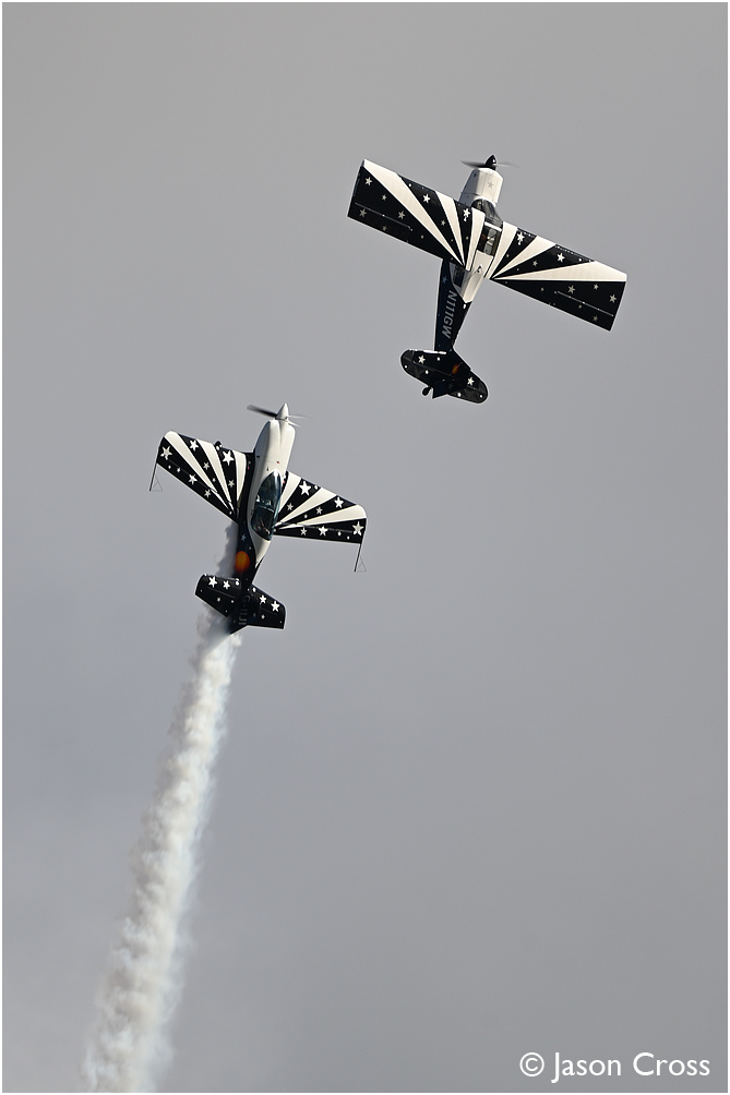 Xtreme XA-42 G-IIJI and American Champion 8KCAB N111GW performing their very entertaining display of aerobatics. Imperial War Museum Duxford Flying Finale Airshow. Date: 8 October 2022 Manipulation Notes: None