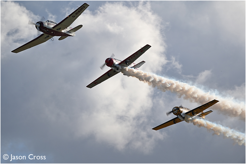 Yalovlev YAK-18T G-HAHU, Yakovlev YAK-52 G-YAKF and Yakovlev YAK-52 G-BXJB. Imperial War Museum Duxford Flying Finale Airshow. Date: 8 October 2022 Manipulation Notes: None