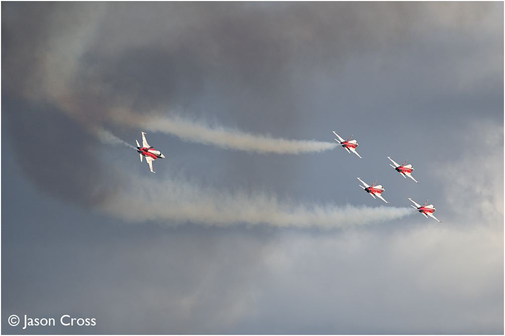 The Patrouille Suisse aerobatic team of the Swiss Air Force performing their display over Duxford in their Northrop F5-E Tiger II jets. Imperial War Museum Duxford Flying Finale Airshow. Date: 8 October 2022 Manipulation Notes: None