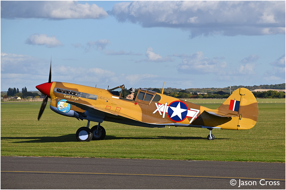 Curtiss P-40F Warhawk 41-19841 taxies in after completing its display. Imperial War Museum Duxford Flying Finale Airshow. Date: 8 October 2022 Manipulation Notes: None