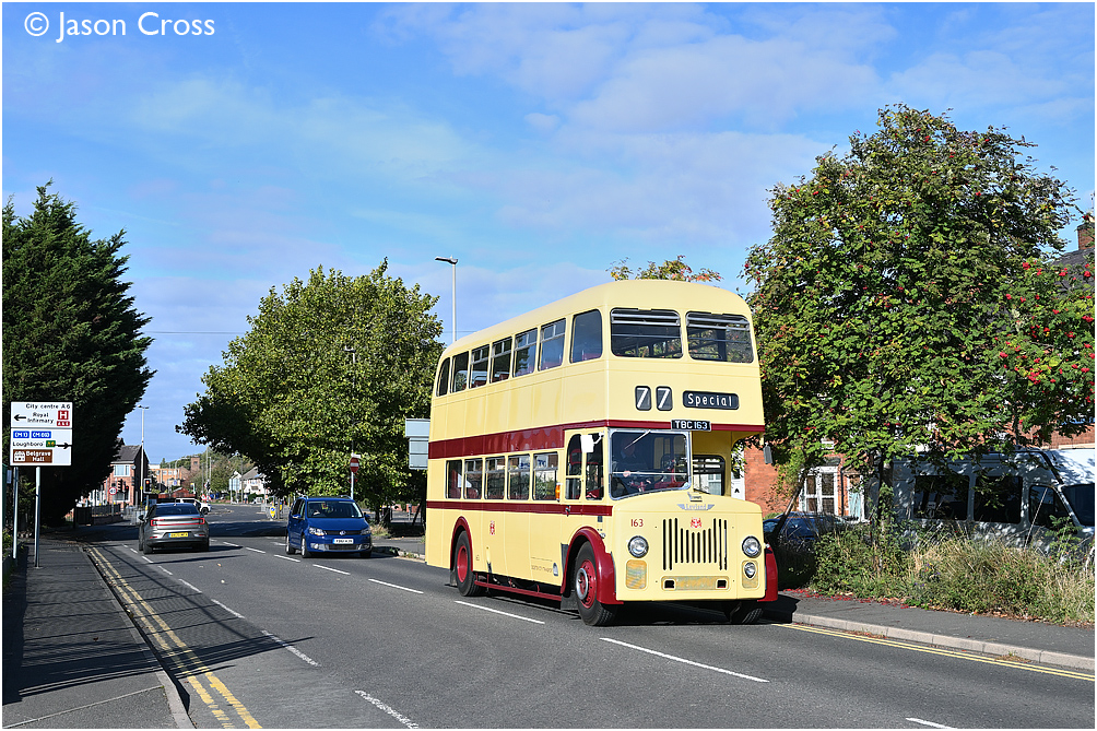 Leicester City Transport Leyland PD3 number 163 arriving empty for its first duty from the Space Centre, seen on Corporation Road. Leicester Transport Heritage Trust 'Half Cab Celebration' event. Date: 9 October 2022 Manipulation Notes: None