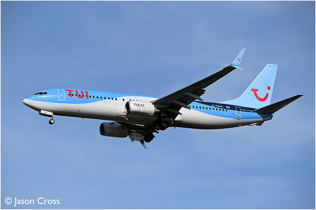TUI Boeing 737 G-GDFP on final approach to runway 27 at East Midlands Airport with a flight from Malaga. Date: 16 October 2022 Manipulation Notes: None