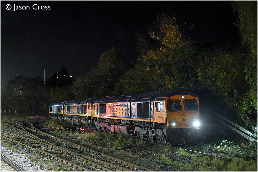 66728, 66774 and 66797 pass through Leicester with a 0M66 Peterborough to Bardon Hill light engine move. Date: 30 October 2022 Manipulation Notes: None
