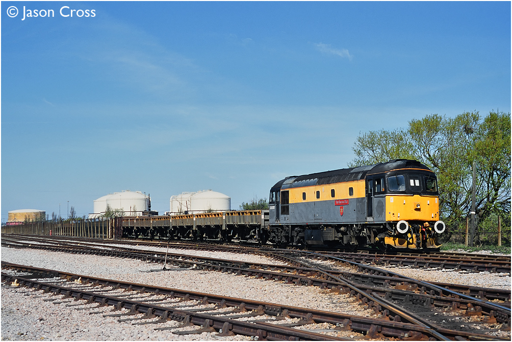 33202 'The Burma Star' arrives in Grain Reception Sidings with empty ballast wagons from Hoo Junction. Date: 4 April 1997 Manipulation Notes: None