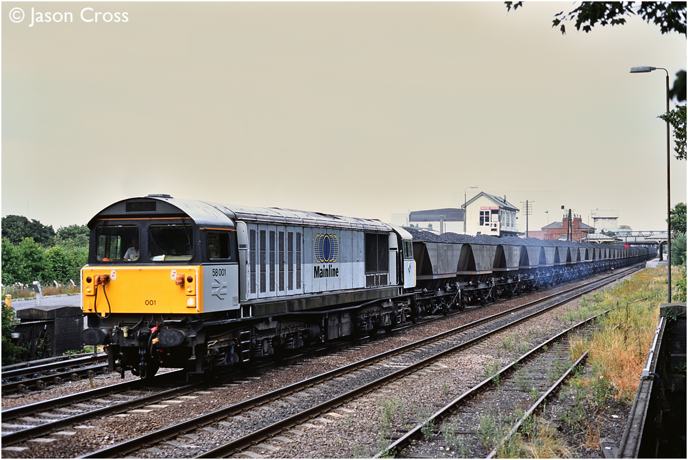58001 departs from Melton Mowbray after reversing there with an Asfordby Mine to Toton Yard coal train. Date: 12 August 1995 Manipulation Notes: None