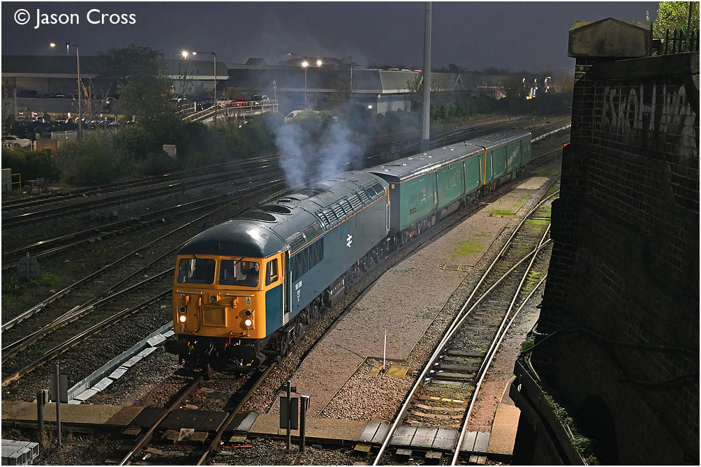 56081 backs two T7 translator vehicles into Leicester Depot as it arrives with a 5M66 1510 from Doncaster Down Decoy Yard. Date: 13 November 2022 Manipulation Notes: None