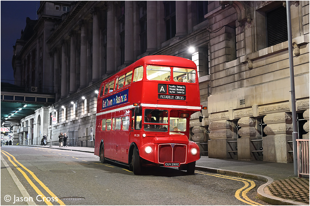 RML2290 sets off from Waterloo station with a Londonerbuses A service to Piccadilly Circus. Date: 19 November 2022 Manipulation Notes: None