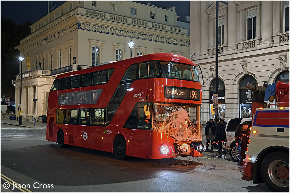 Waterloo Place in Westminster with LT155 involved in an incident. It would appear that the bus had smashed into the rear of a row of parked cars. Date: 20 November 2022 Manipulation Notes: None