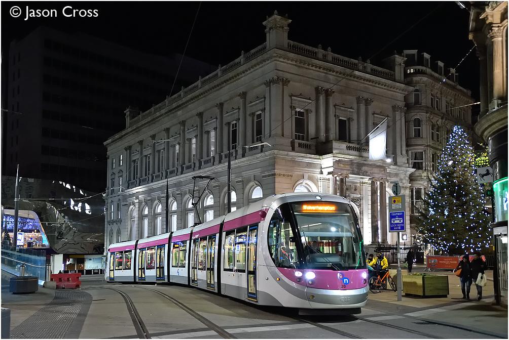 Tram 20 departs from Grand Central in Birmingham with a service for Wolverhampton St George's. Date: 18 December 2016 Manipulation Notes: None