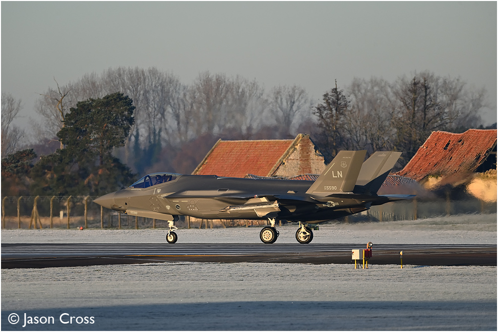 USAF F35A 20-5590 lining up on runway 24. RAF Lakenheath. Date: 15 December 2022 Manipulation Notes: None