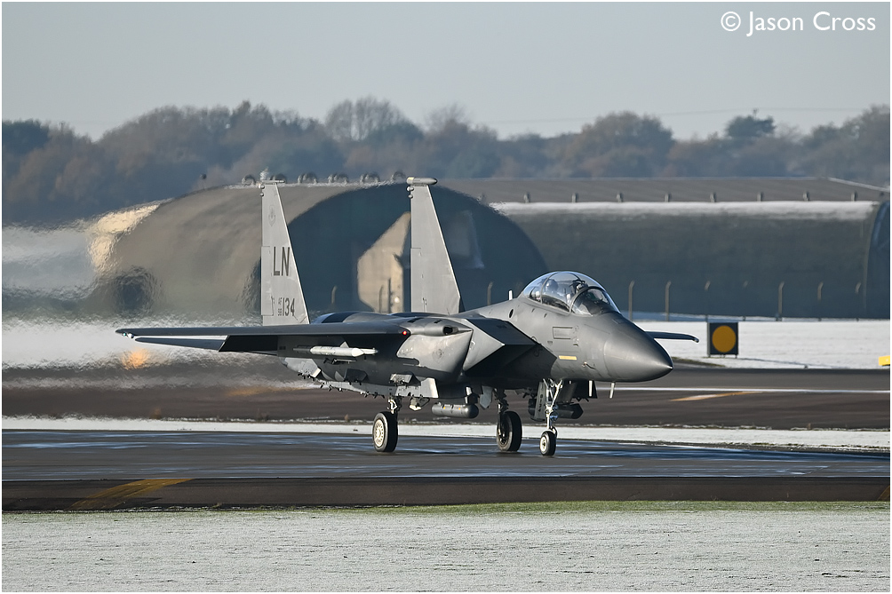 USAF F15E 98-0134 taxiing to runway 24. RAF Lakenheath. Date: 15 December 2022 Manipulation Notes: None Camera mounted on a tall pole and remotely fired