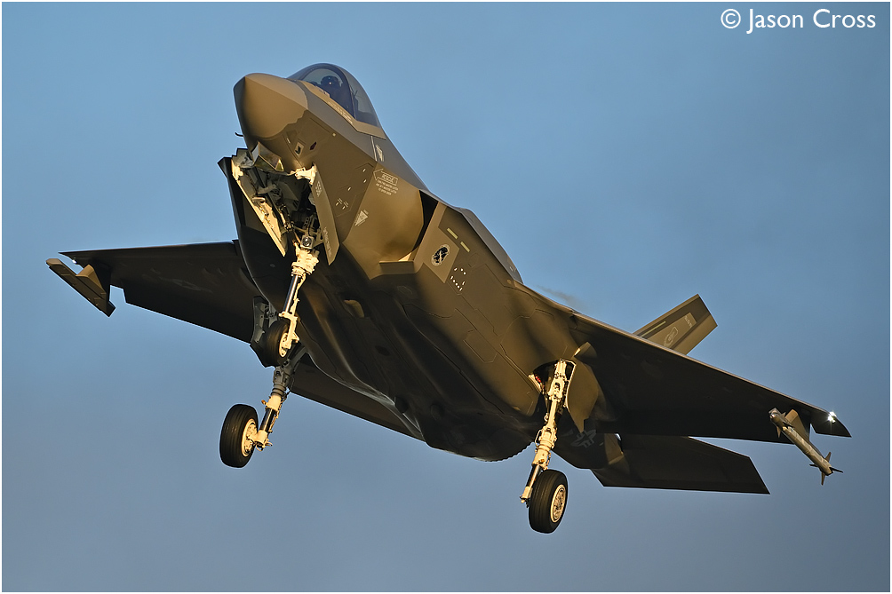 Catching some golden light from the setting sun, USAF F35A 20-5581 on final approach to runway 24. RAF Lakenheath. Date: 15 December 2022 Manipulation Notes: None