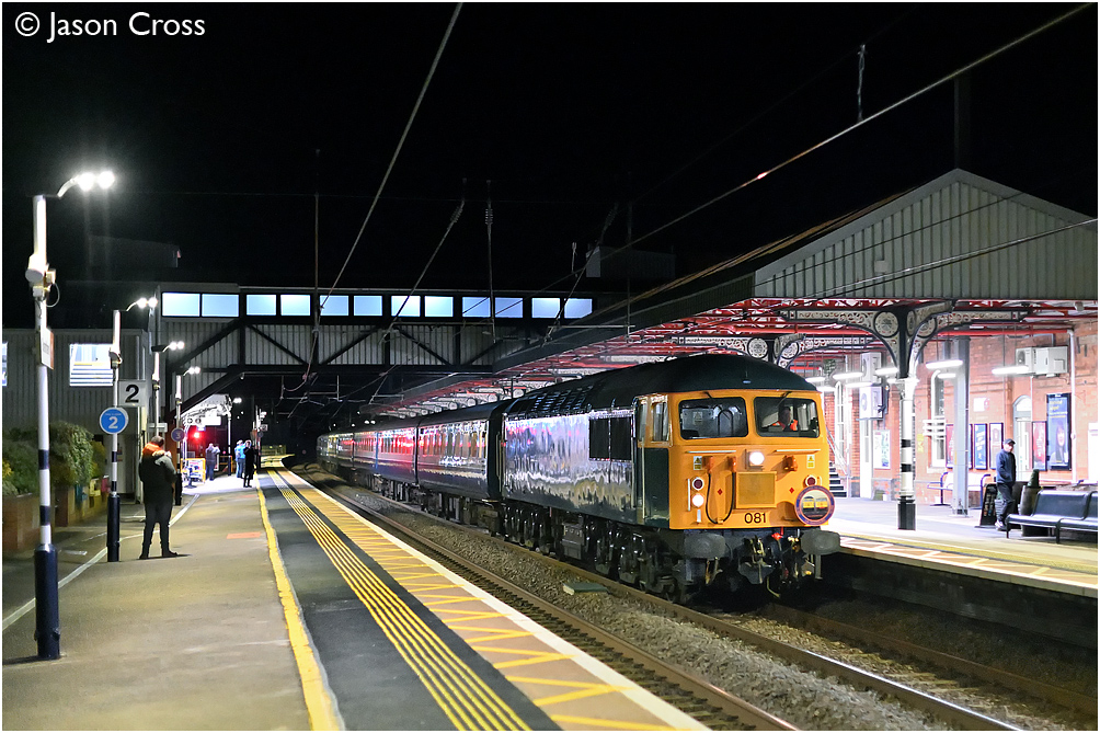 56081 passes through Grantham at speed while working 1Z59 1539 Spring Bank South Junction to Peterborough, the GBRf Class 56 Farewell railtour. Date: 14 January 2023 Manipulation Notes: None