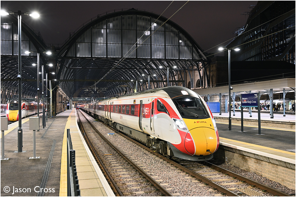 801107 and 800202 stand at London King's Cross with the 1N34 2000 to York. Date: 28 January 2023 Manipulation Notes: None