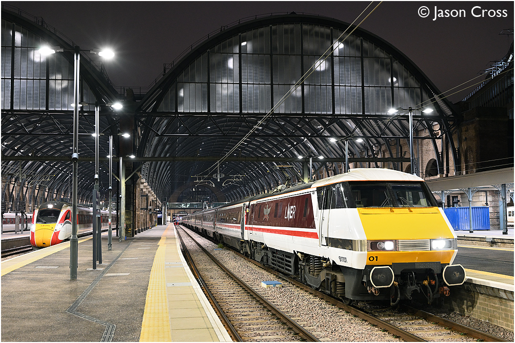 91101 'Flying Scotsman' waits to depart from King's Cross with the 1D34 2200 to Leeds. 801230 is on the left and is about to depart empty to Bounds Green depot. Date: 28 January 2023 Manipulation Notes: None