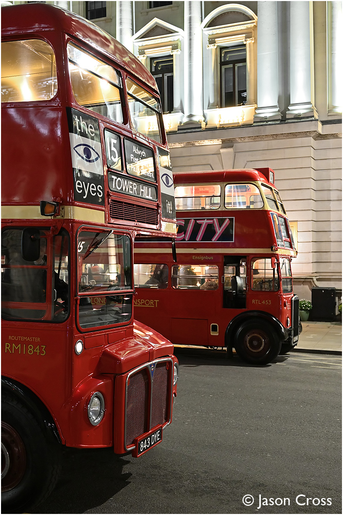 RM1843 and RTL453 side by side in Waterloo Place in Westminster, London. Timeline Events photo shoot. Date: 29 January 2023 Manipulation Notes: None