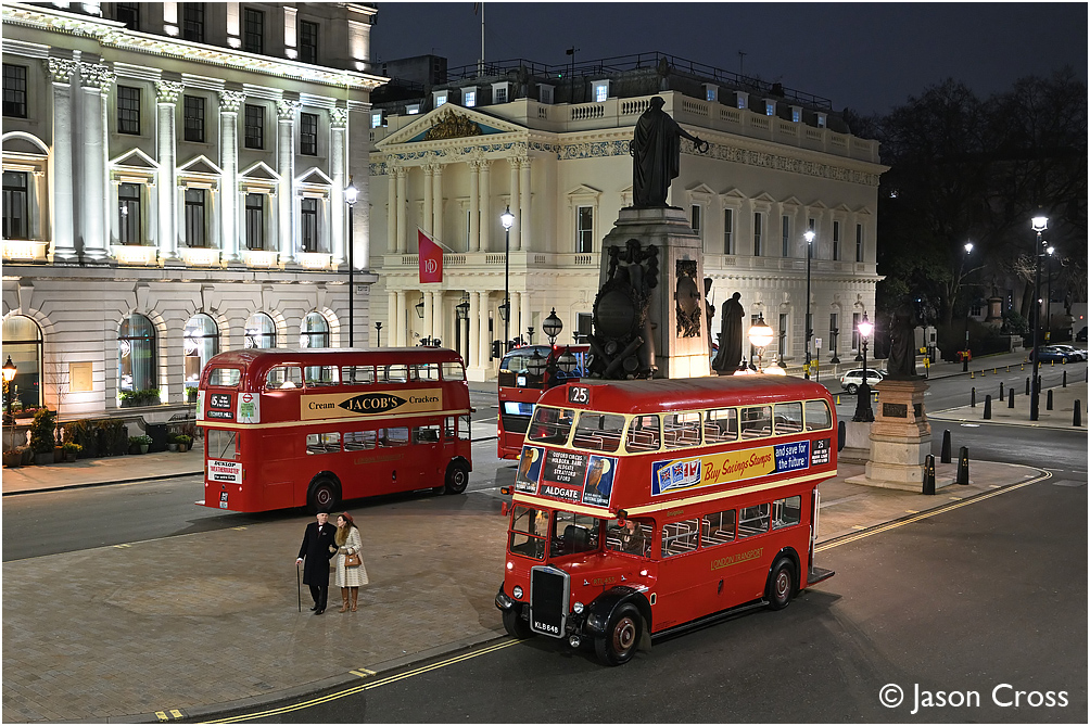 RTL453 and RM1843 in Waterloo Place in Westminster, London. Timeline Events photo shoot. Date: 29 January 2023 Manipulation Notes: None Camera mounted on a tall pole and remotely fired