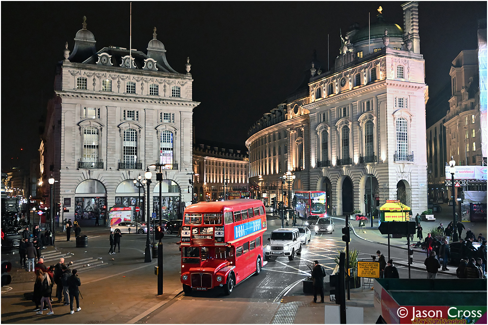 RM1843 passes through Piccadilly Circus, Westminster, London. Timeline Events photo shoot. Date: 29 January 2023 Manipulation Notes: None Camera mounted on a tall pole and remotely fired