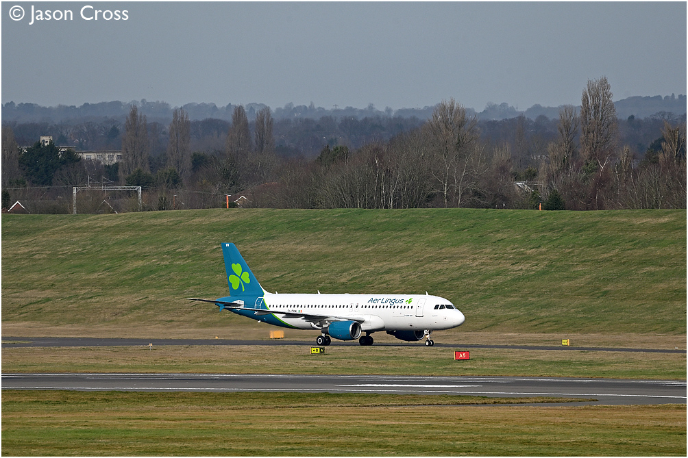 Aer Lingus Airbus A320 EI-DVN arriving from Dublin. Birmingham Airport. Date: 5 February 2023 Manipulation Notes: None
