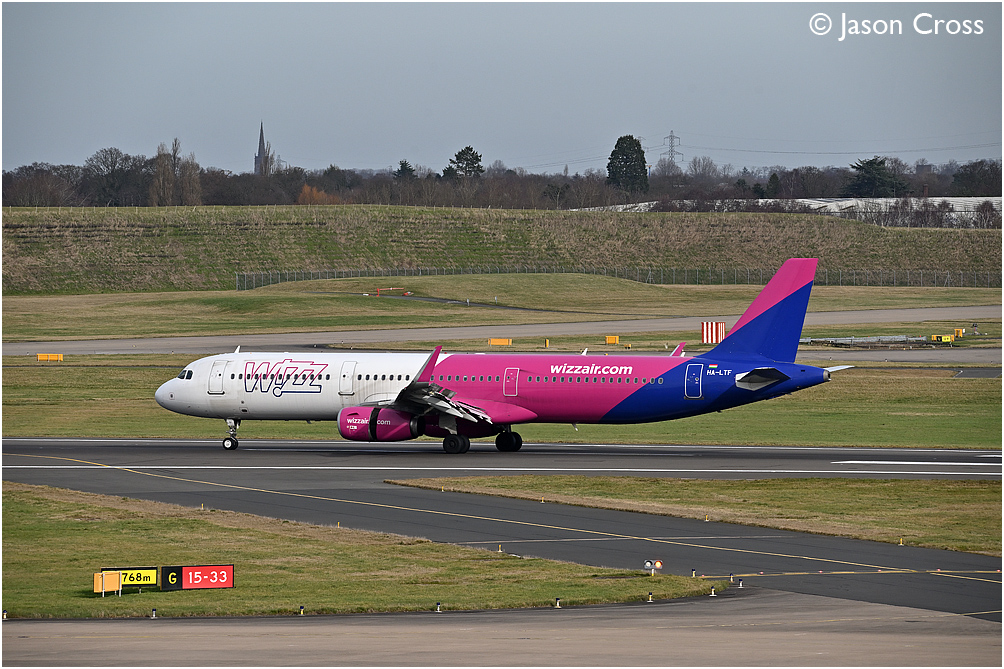 Wizz Air Airbus A321 HA-LTF touches down with a flight from Wroclaw. Birmingham Airport. Date: 5 February 2023 Manipulation Notes: None