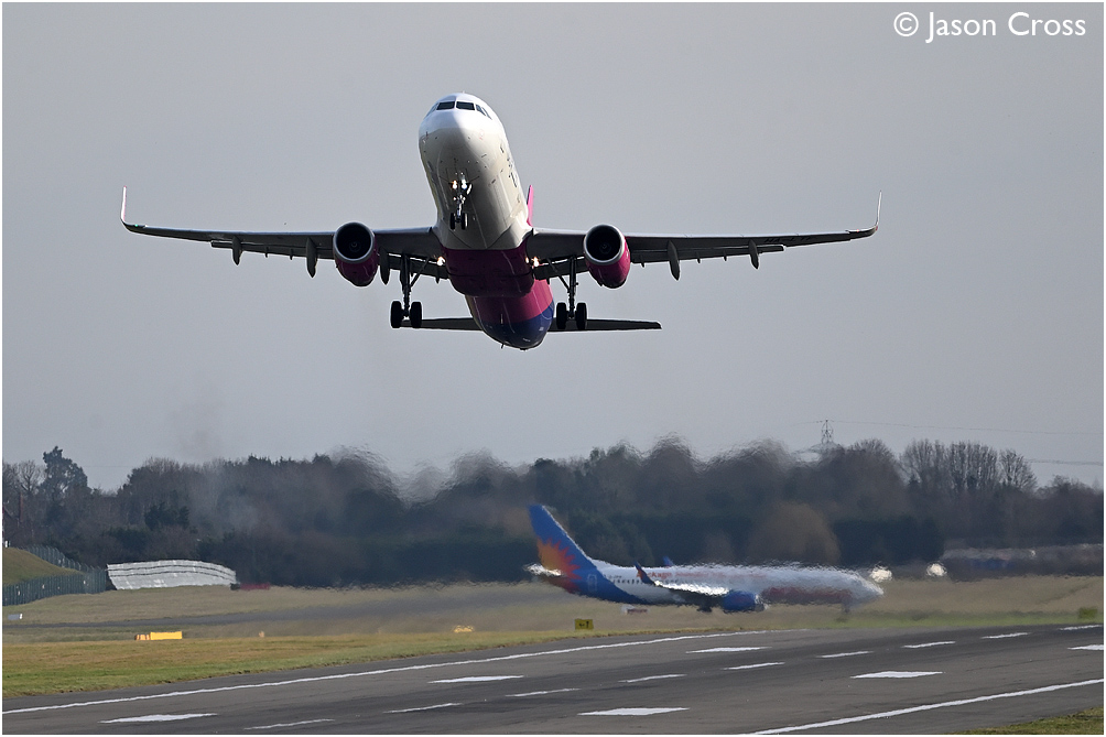 Wizz Air Airbus A321 HA-LTF takes off from runway 33 with a flight for Wroclaw. Birmingham Airport. Date: 5 February 2023 Manipulation Notes: None