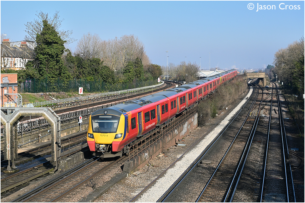 707014 and 707015 climb Wimbledon Flyover with 2H30 1111 Shepperton to London Waterloo. Date: 14 February 2023 Manipulation Notes: None