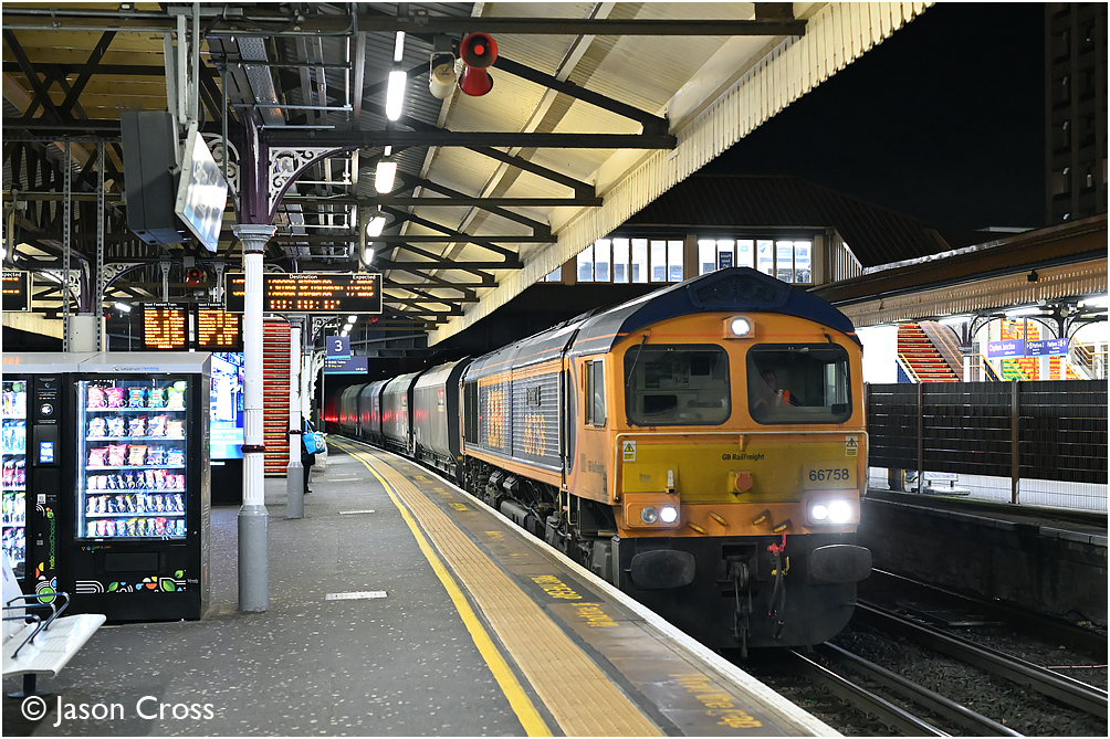 66758 rolls through Clapham Junction with 6O66 1819 Neasden Charrington to Tonbridge West Yard. Date: 16 February 2023 Manipulation Notes: None