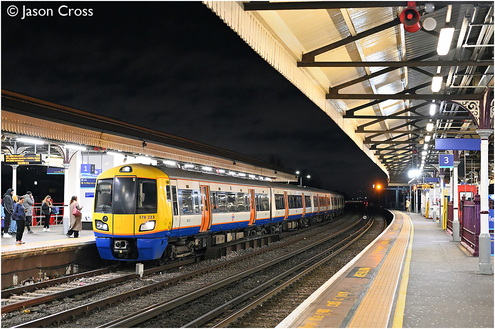 378223 terminating in platform 1 at Clapham Junction with the 2Y11 1824 from Stratford. Date: 16 February 2023 Manipulation Notes: None