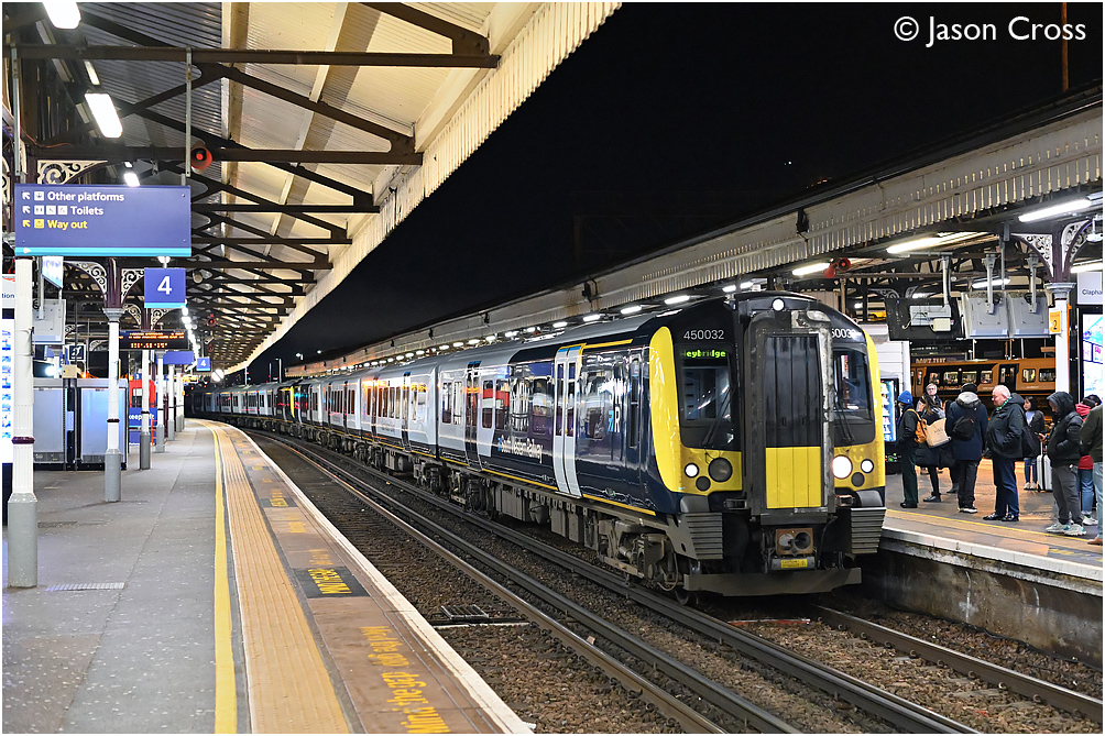 450032 and 450124 roll into Clapham Junction's platform 5 with the 2S61 1922 London Waterloo to Weybridge service. Date: 16 February 2023 Manipulation Notes: None