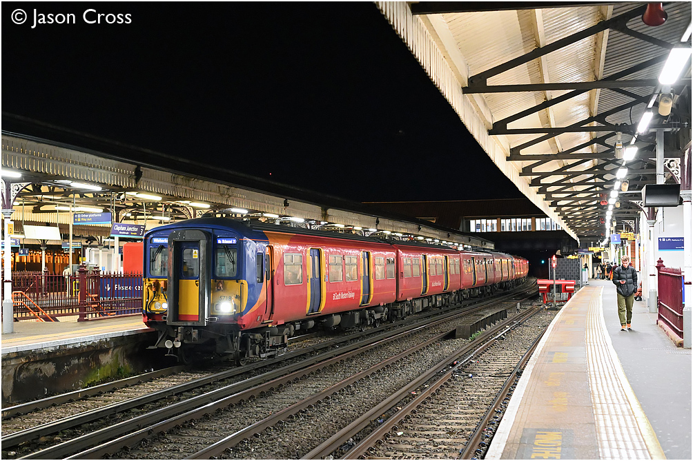 Class 455s 5718 and 5750 arrive in platform 3 at Clapham Junction with the 2K55 1857 London Waterloo to London Waterloo. Date: 16 February 2023 Manipulation Notes: None