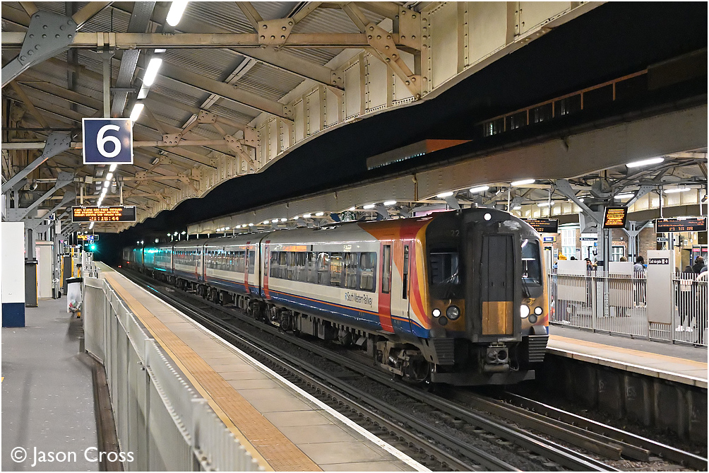 444022 and 444006 race through Wimbledon with the 1B69 2104 London Waterloo to Bournemouth service. Date: 16 February 2023 Manipulation Notes: None