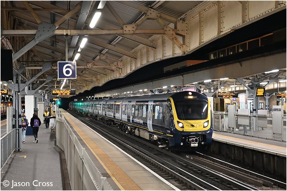 701013 races through Wimbledon with a 5Q43 2114 London Waterloo to Eastleigh Depot shake down run. Date: 16 February 2023 Manipulation Notes: None