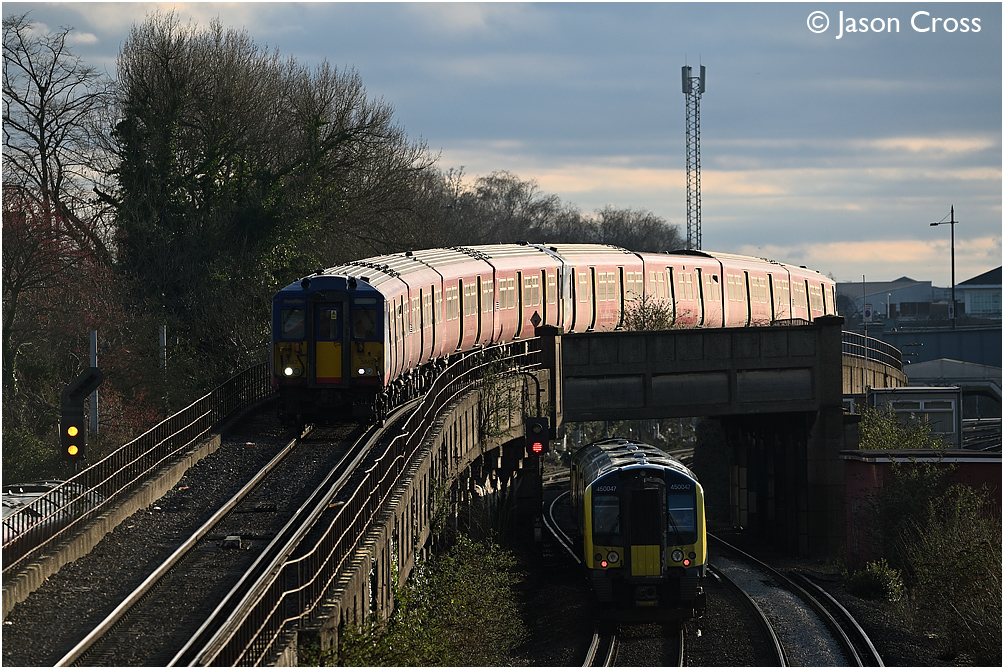 5862 and 5739 on 2M46 1534 Chessington South to London Waterloo negotiate the Wimbledon flyover as 450047 passes beneath on 2P47 1545 London Waterloo to Portsmouth & Southsea. Date: 20 February 2023 Manipulation Notes: None