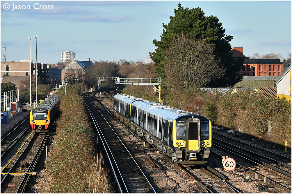 450086 and 450037 on 1A47 1553 London Waterloo to Alton are captured between Earlsfield and Wimbledon. Date: 20 February 2023 Manipulation Notes: None