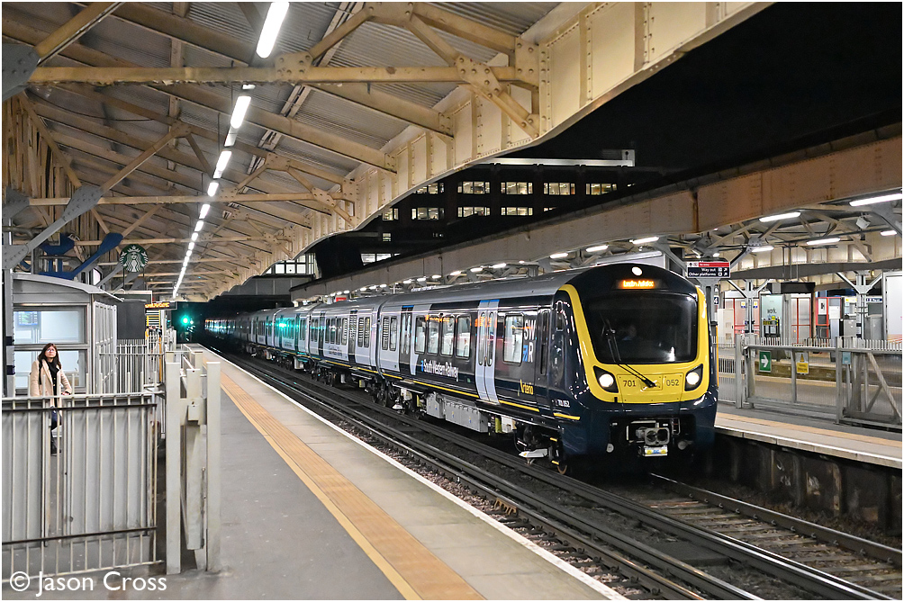 701052 passes through Wimbledon while working a 5Q42 1833 Southampton Central to London Waterloo. Date: 20 February 2023 Manipulation Notes: None