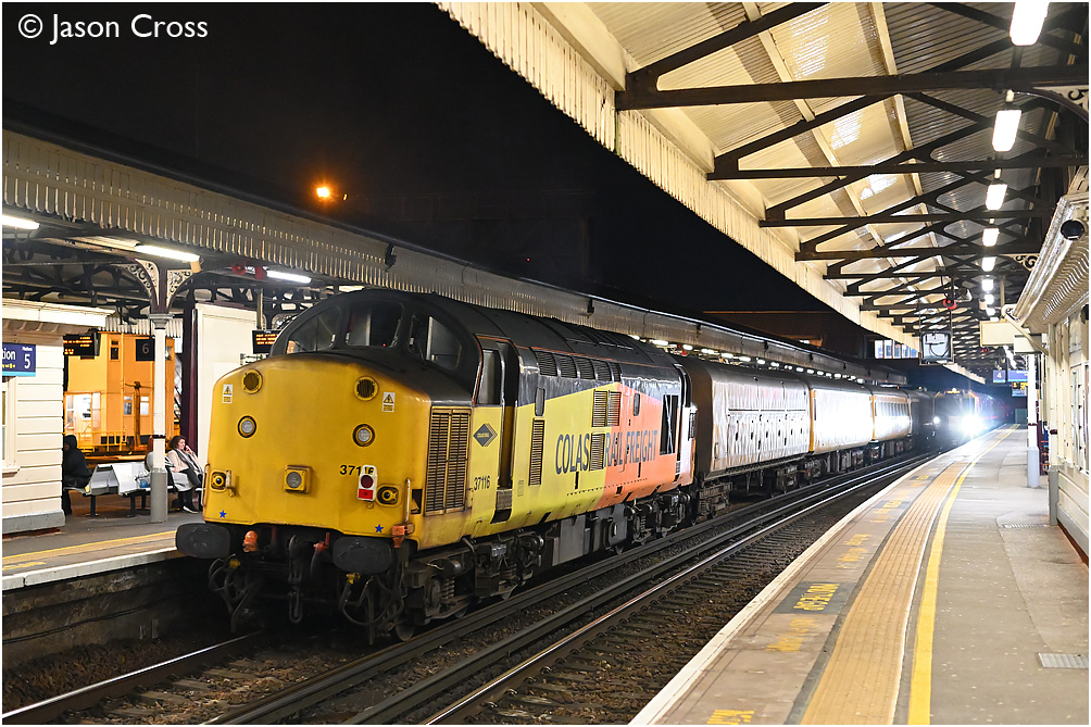 Almost bowled by a unit, 37116 brings up the rear of a 3Q07 2023 Tonbridge West Yard to Derby RTC test train at Clapham Junction. Date: 20 February 2023 Manipulation Notes: None