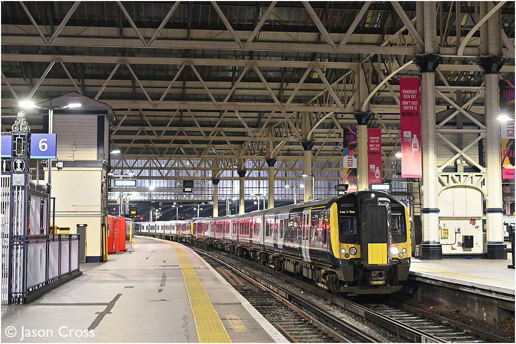 450015 and 450045 enter Waterloo's platform 7 with the 1A64 1835 Alton to London Waterloo. Date: 21 February 2023 Manipulation Notes: None