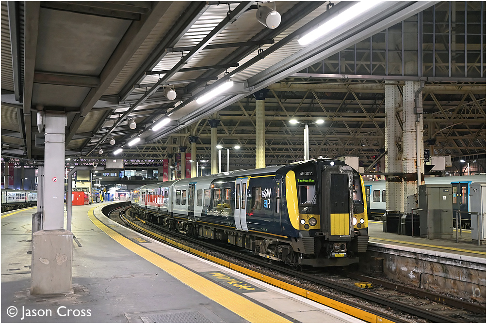 450015 waits to depart from Waterloo with the 2L67 2042 to Basingstoke. Date: 21 February 2023 Manipulation Notes: None