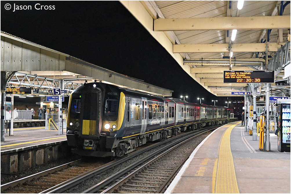 450111 passes through Vauxhall with the 2T62 1959 Portsmouth Harbour to London Waterloo. Date: 22 February 2023 Manipulation Notes: None