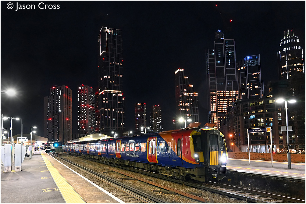 458512 and 458520 pause at Vauxhall with the 2S62 1910 Weybridge to London Waterloo. Date: 23 February 2023 Manipulation Notes: None