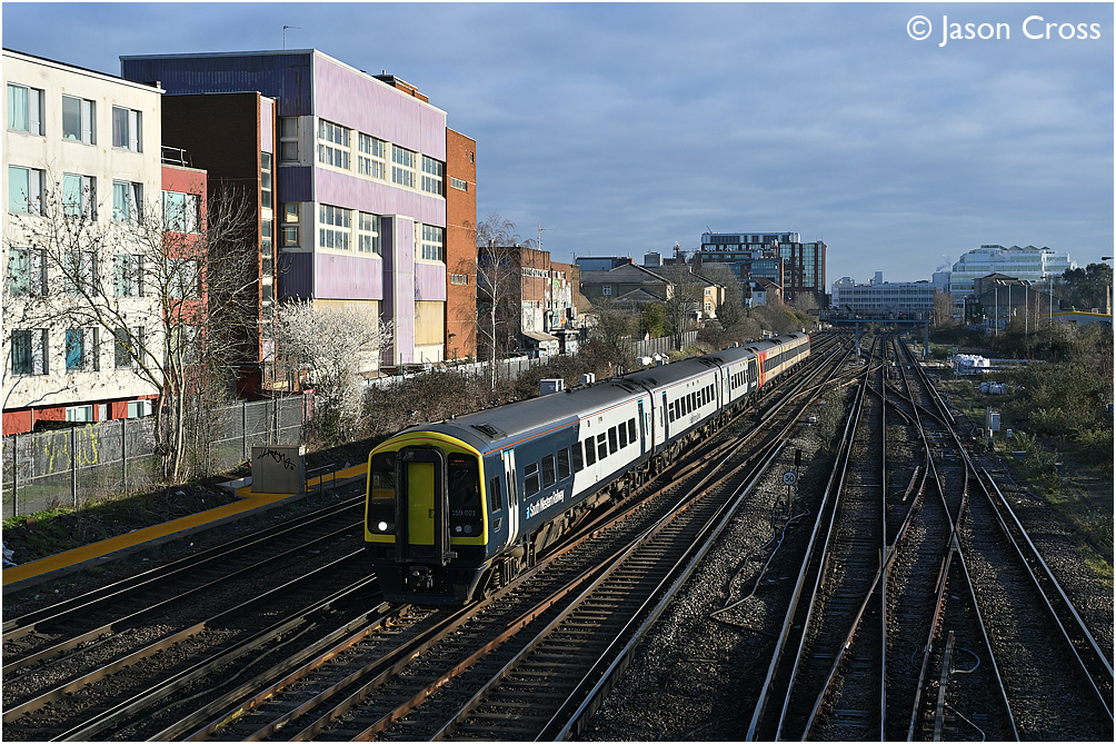 159021 and 159105 pass Wimbledon with the 1L17 0820 London Waterloo to Exeter St Davids. Date: 27 February 2023 Manipulation Notes: None
